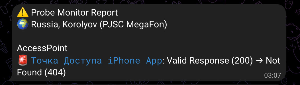 The app’s availability in Russia was tracked using the NRTK Pulse service, which I recently launched. In both cases—the website block and app removal—the service notified me in real time.